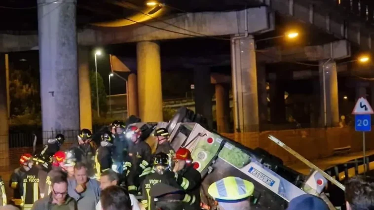 Das Unglück ereignete sich kurz vor 20 Uhr auf der Überführung der Verbindungsstraße von Mestre nach Marghera und zur Autobahn A4. Berichten zufolge stürzte der Bus etwa zehn Meter in die Tiefe von der Vempa-Überführung in Mestre und landete zwischen einem Lagerhaus und den Gleisen des Bahnhofs Mestre, wo er Feuer fing.